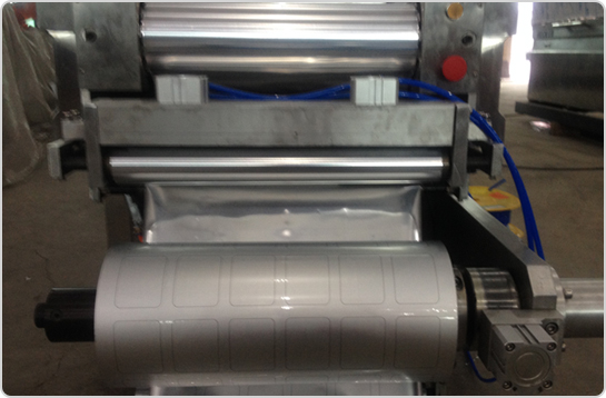 4、設(shè)備中部(封口和真空區(qū)域) 由封口模具和上加熱模具,設(shè)備通過步進(jìn)到達(dá)封口真空區(qū)域,下膜模具通過氣缸上升、壓緊上加熱模具,再通過真空管路進(jìn)行抽真空,最后完成封口。 |